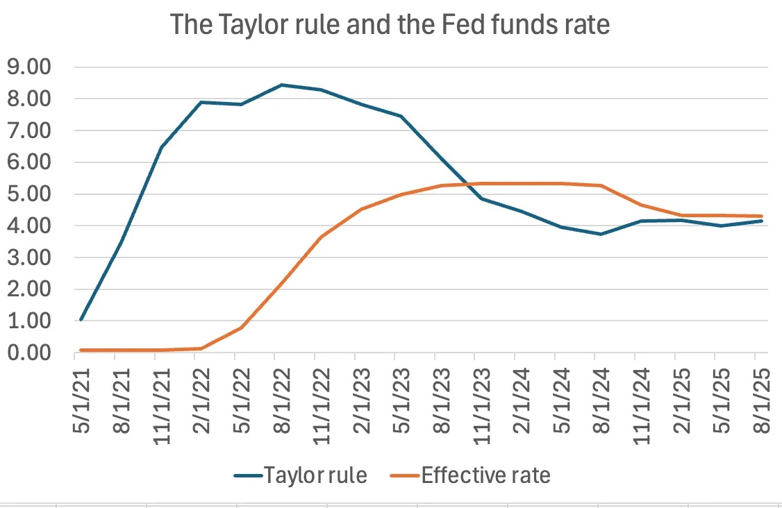 В 2021–2022 годах Федеральный Резерв решил, что у него есть веская причина не следовать правилу Тейлора. Инфляция была очень высокой, и в соответствии с правилом Тейлора процентные ставки должны были быть очень высокими. Но Федеральный Резерв считал, что всплеск инфляции был временным, вызванным нарушениями в цепочке поставок после Covid, поэтому воздержался от повышения ставок. Вот что рекомендует правило Тейлора (FOMCTaylor99UR, если быть точным) и что на самом деле сделал Федеральный Резерв: