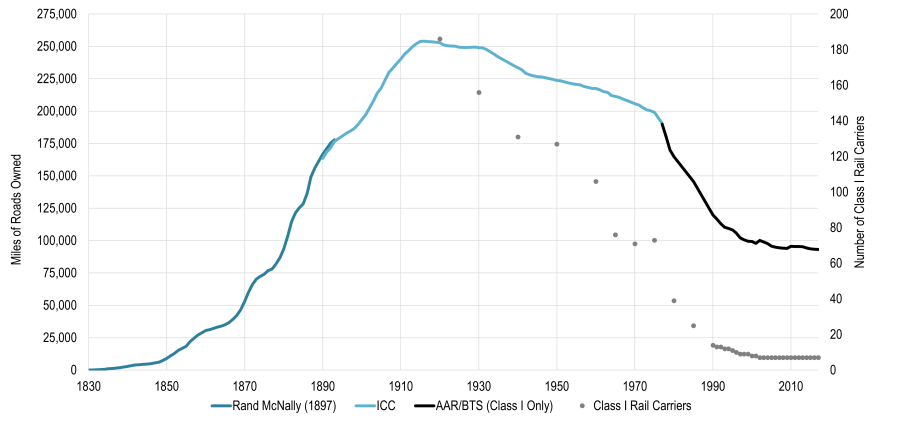 Общая протяжённость путей достигла пика в 1916 году и затем начала сокращаться. Банкротство Penn Central в 1970 году стало крупнейшим корпоративным крахом в истории США на тот момент. Сегодня протяжённость железнодорожной сети составляет около 140 000 миль, что на 40% меньше пикового значения. Весь цикл — инновация, спекуляция, чрезмерное строительство, крах, консолидация, регулирование и упадок — занял примерно 60 лет.