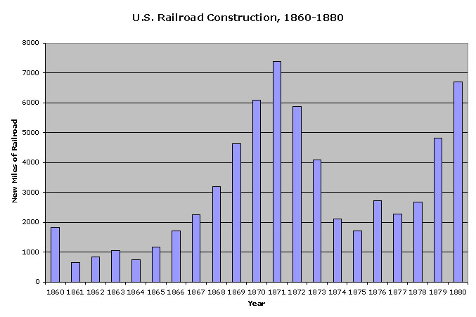 Сеть выросла с 35 000 миль в конце войны до 70 000 миль к 1873 году, привлекая огромный поток иностранного капитала. По книге Генри Пэрриса (Henry Parris) «Медленный поезд в рай» (Slow Train to Paradise), 75% железнодорожных ценных бумаг принадлежали британским и голландским инвесторам, искавшим возможности роста, которых не было в Европе.