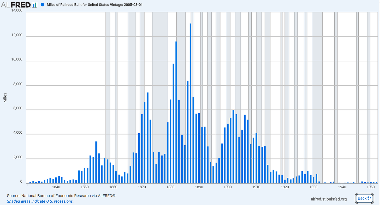 Во-первых, я думаю, мы приближаемся к совокупным инвестициям в ~1 триллион в реальном выражении, которые наблюдались во время пузыря телекоммуникаций с 1996 по 2000 год. Вполне вероятно, что совокупные капитальные затраты в реальном выражении значительно превысят показатели телеком-бума, и это заставляет меня искать аналогии в более далеком прошлом. Я считаю, что еще одно существенное различие между развитием телекоммуникаций и железных дорог заключается в том, что государство было крайне вовлечено и играло ключевую роль во всем процессе строительства.