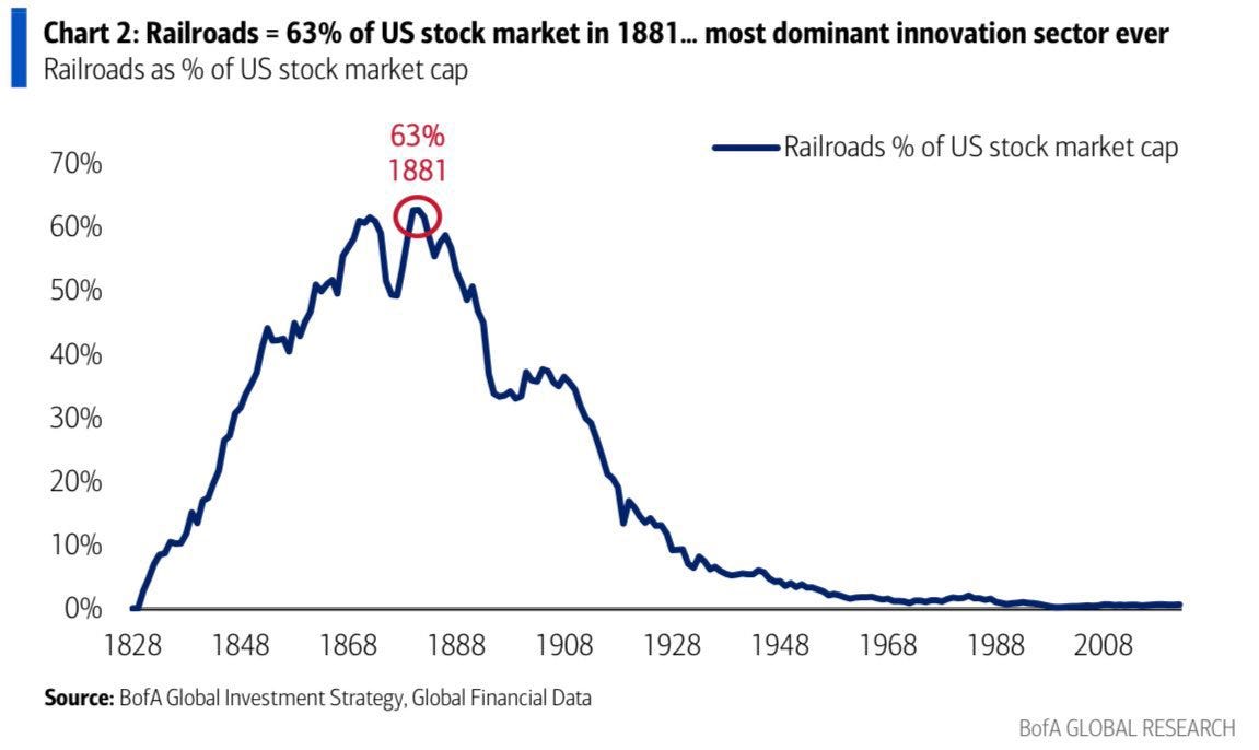 Кроме того, история железных дорог позволила мне оценить, насколько тесно связаны капитал и технологии. Основными реальными целями этого цикла становятся вопрос общего объема долга и способность его обслуживать. К сожалению, железнодорожный пузырь был настолько перегрет, что с современной точки зрения это даже не поддается логике. Все дороги строились исключительно на спекуляциях!
