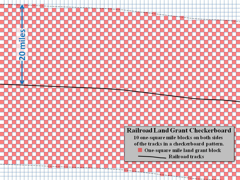 Нашлось изящное решение: предоставить компании полосу земли шириной от 10 до 40 миль вокруг будущей трассы и разделить участки поровну между железной дорогой и государством. Расположенная в глуши, эта земля дорожала благодаря строительству пути. Нечётные участки отходили железным дорогам, которые выпускали обеспеченные ими ценные бумаги.