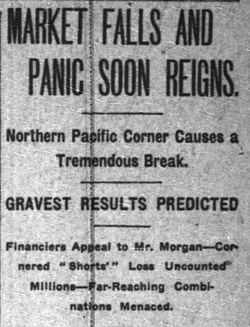 Игроки на понижение, поставившие против роста цены, спровоцировали самую масштабную за всю историю короткую позицию, которую пришлось закрывать. Поскольку титаны индустрии скупали акции по любой цене ради контроля, они взвинтили котировки до небес. Гарриман и Хилл скупили больше акций, чем существовало в обращении, так как «медведи» продавали бумаги, которыми не владели или не могли поставить. Чтобы покрыть свои позиции, им пришлось продавать всё остальное. Акции упали на 20–50% за один день, а нехватка ликвидности вызвала Панику 1901 года. Всё это — ради контроля над железной дорогой и последовавшей за этим распродажей.