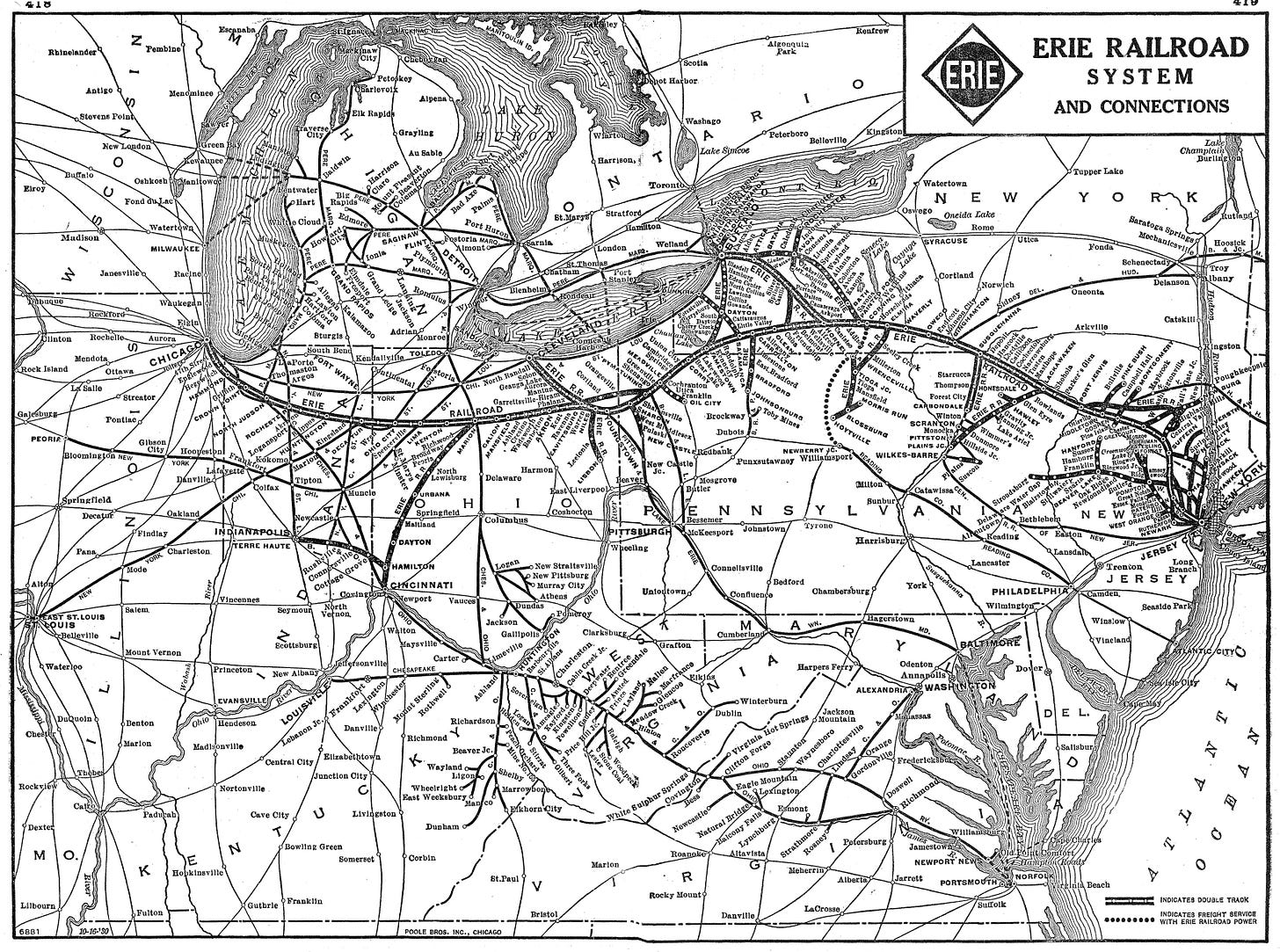 Железные дороги, «Позолоченный век» (Gilded Age) и «Бароны-разбойники» (Robber Barons) неотделимы друг от друга. Люди, которые строили и растаскивали эти компании, стали определяющими персонами эпохи. Ниже — краткое руководство по ключевым участникам и их железным дорогам. Начнём с самой знаковой дороги того времени — Эри (Erie).