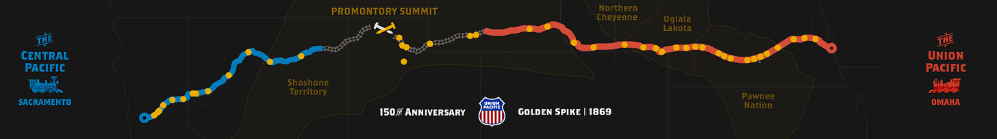 Абсурдность ситуации была очевидна даже в момент «Большого рывка» (Big Bang): Промонтори-Саммит (Promontory Summit) выбрали не по инженерным или коммерческим критериям. Конгресс настоял на этом, поскольку Union Pacific и Central Pacific, соревнуясь за земельные гранты, фактически строили линии мимо друг друга. Параллельные участки шли бок о бок более 200 миль, и обе компании прокладывали пути по одному и тому же участку Юты, чтобы получить больше земли. В итоге Конгресс вмешался и назначил Промонтори местом встречи. 10 мая 1869 года, через семь лет после принятия закона Pacific Railroad Act, был забит золотой костыль.