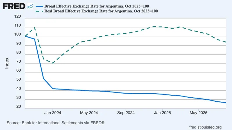 И, как и следовало ожидать, Аргентина под руководством Милеи пошла по тому же злополучному сценарию. Как показано на графике ниже, Милеи начал с значительной девальвации песо (синяя линия), за которой последовало гораздо более медленное снижение курса, направленное на снижение инфляции. Но инфляция оставалась достаточно высокой, так что реальный обменный курс Аргентины (зеленая пунктирная линия) после первоначального падения быстро вырос, что сделало Аргентину менее конкурентоспособной: