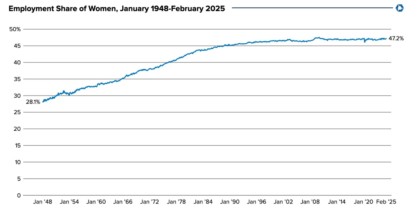 Вопреки возможному предположению, «тихая революция» по Голдин касалась не самого факта увеличения доли женщин на оплачиваемой работе. Эта тенденция началась еще в 1940-х и в основном достигла пика к концу 1970-х. На графике ниже показана доля рабочих мест в Америке, занимаемых женщинами: сейчас это почти 50%, но и в начале 1970-х показатель был весьма значительным: